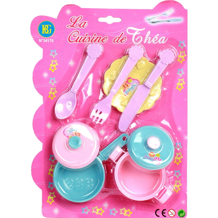 Une dinette de Théa pour qu'elle s'amuse avec faire les grandes pourquoi pas. Vous pourrez lui offrir pour son anniversaire ou encore une autre petite fille sage. Elle fait 29*19 centimètre avec 8 pièces qui est composé d'un couteau, d'une cuillère, de casserole et de fourchette. De couleur rose et bleu votre fille va adorer.