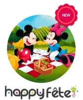 On peut voir sur l'image le couple Mickey et Minnie Mouse en plein pique-nique, avec des pommes dans un panier et une prairie en arrière-plan.