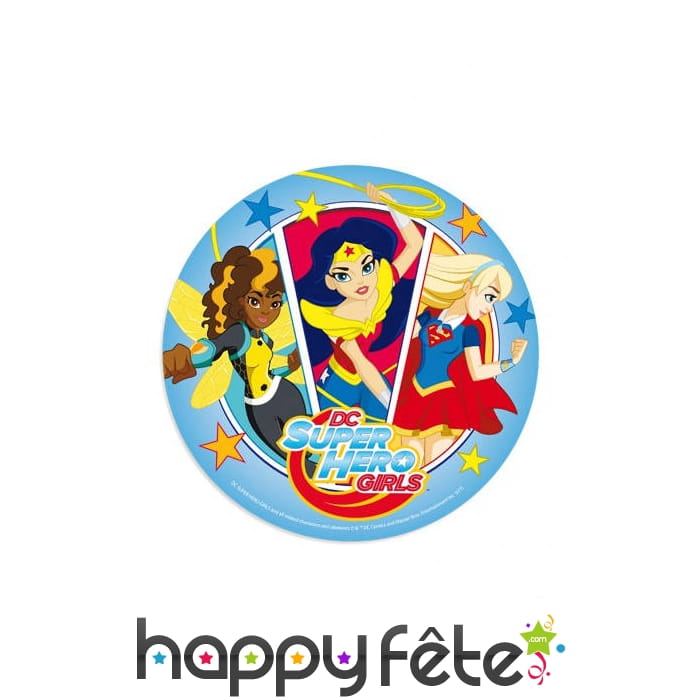 La décoration fait 20 cm de diamètre et présente de super justicières selon un modèle aléatoire: Bumblebee, Wonder Woman et Super Girl, ou un autre composé de Wonder Woman, Supergirl et Batgirl.