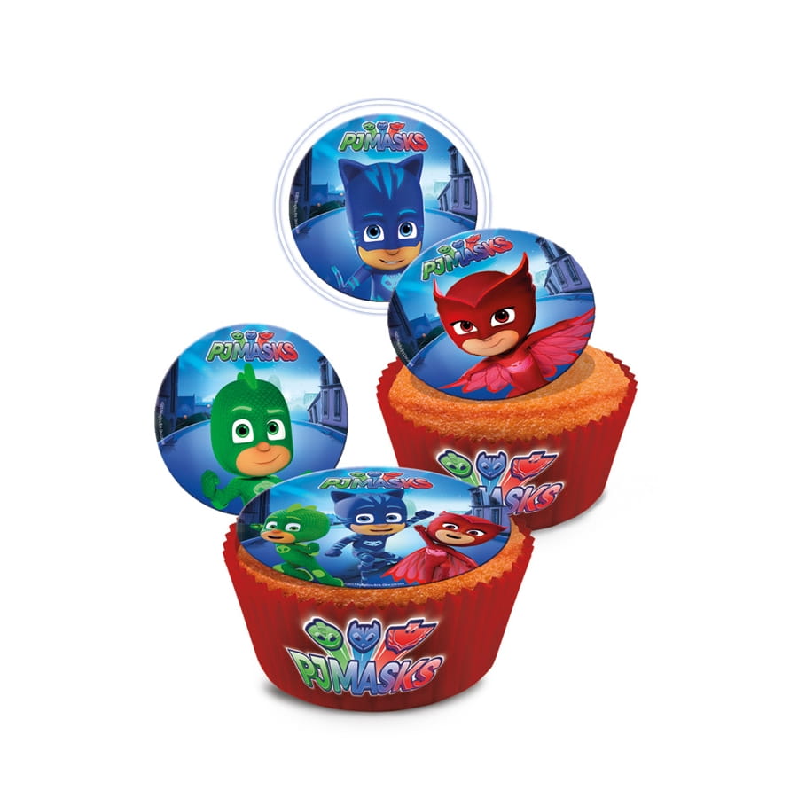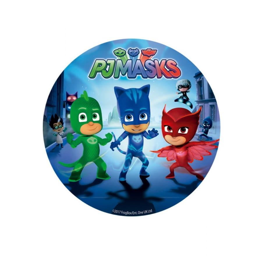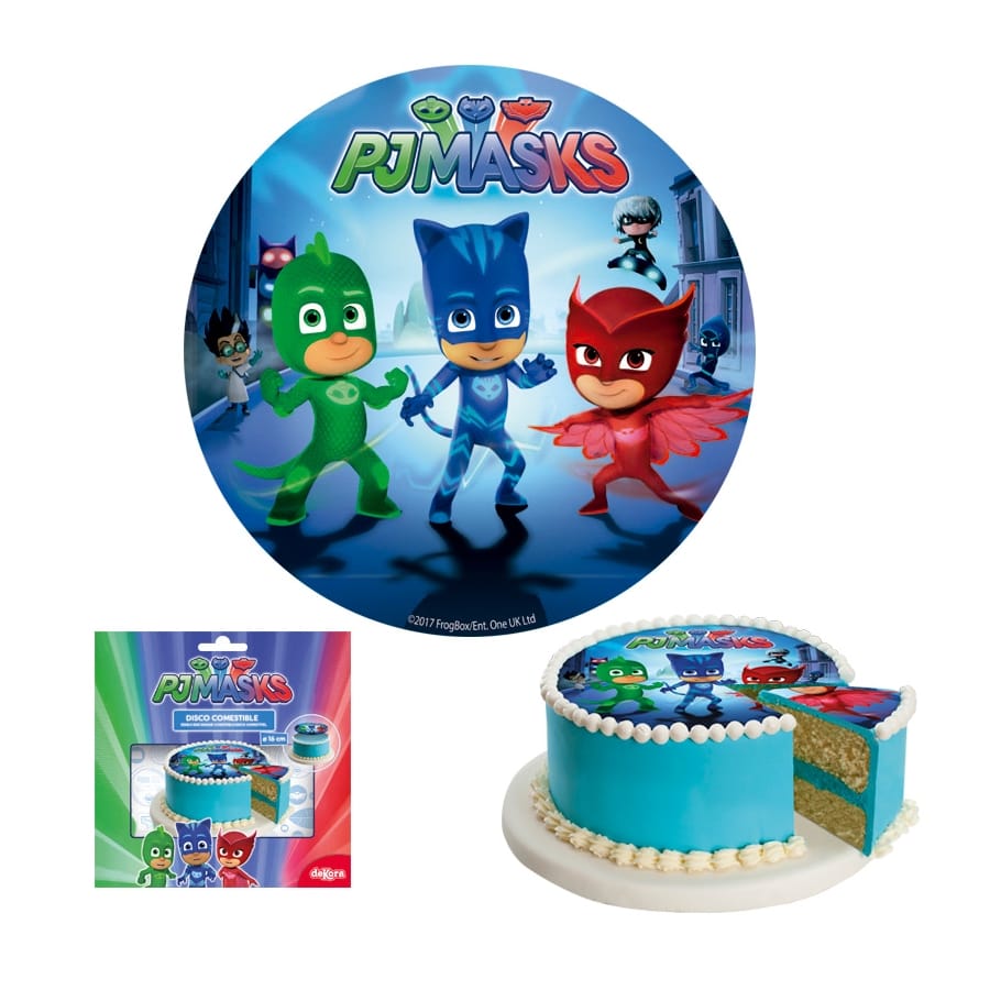 Les Pyjamasques s'imposent en force sur ce disque en sucre Pjmasks de 16cm. Sur un fond bleu, avec les trois petits héros dans leurs fameux pyjamas, ce dernier pourra très facilement se poser comme décoration sur un gâteau d'anniversaire. Le disque a un diamètre de 16 cm et pèse 15 g, il est tout à fait comestible.