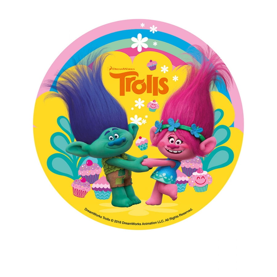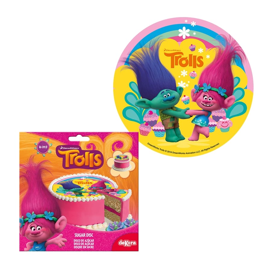 Le goûter d'anniversaire s'annonce magique avec les Trolls dans les parages. Retrouvez ces fabuleuses créatures aux cheveux fluo sur ce disque en sucre Trolls. Ce disque rendra le gâteau encore plus appétissant dans ses multiples couleurs éclatantes. Il fait 16 cm de diamètre. L'article est sans OGM et contient de la lécithine de soja.