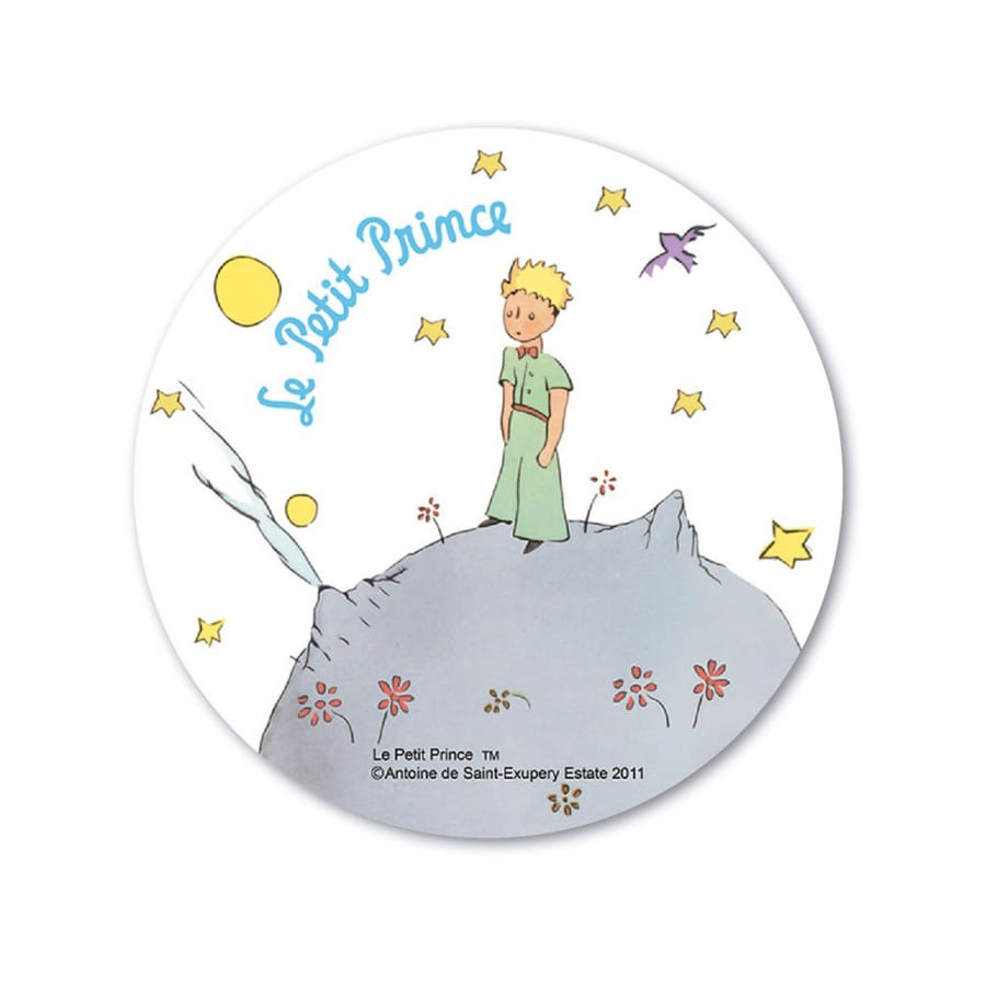 Il représente le petit prince placé sur une lune grise avec, en arrière plan, un ciel blanc plein d'étoiles jaunes.