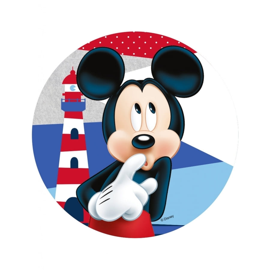 Mickey imprimé sur un fond marin avec en arrière plan un phare.