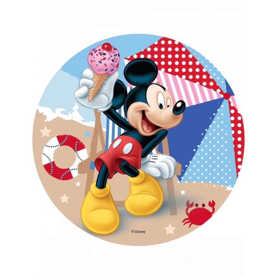 Mickey à la plage avec un parapluie multicolore, une bouée de sauvetage, un crabe et un cornet de glace.