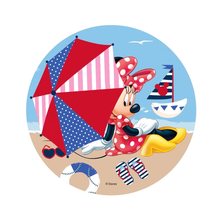 Minnie à la plage accompagnée d'un parasol haut en couleur et assorti à sa tenue, un voilier, une bouée de sauvetage, des sandales et des lunettes de soleil.