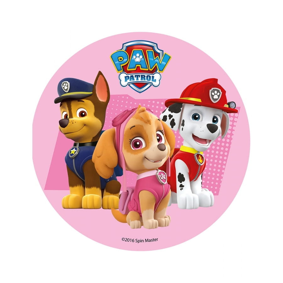 Découvrez notre disque disque Pat Patrouille rose en sucre de 21cm.