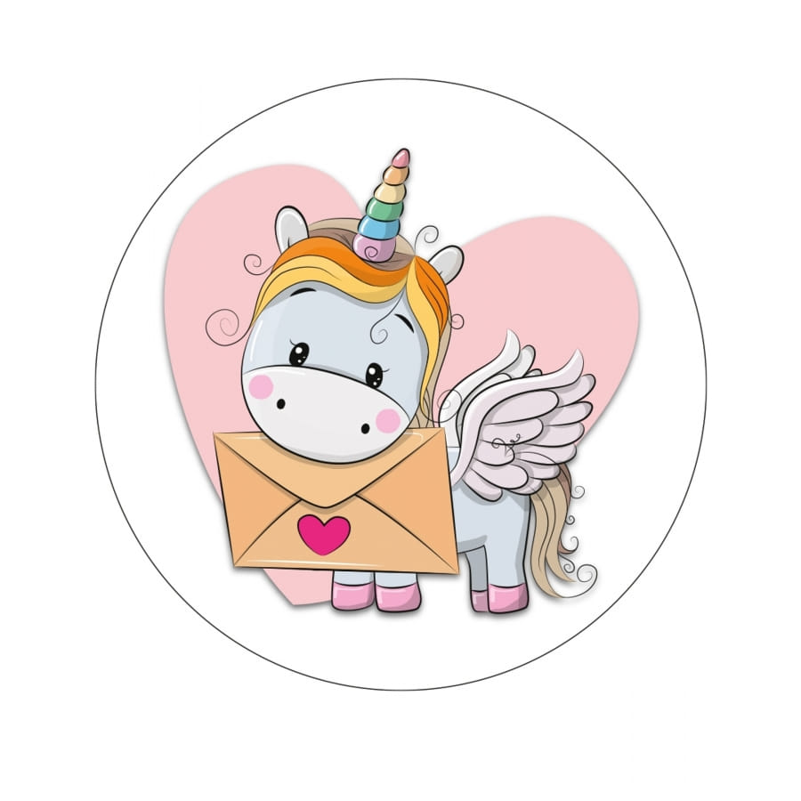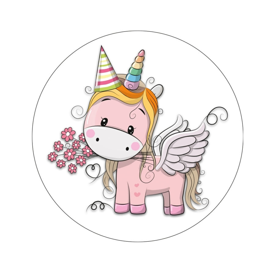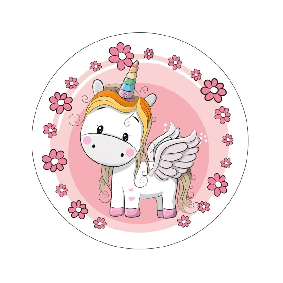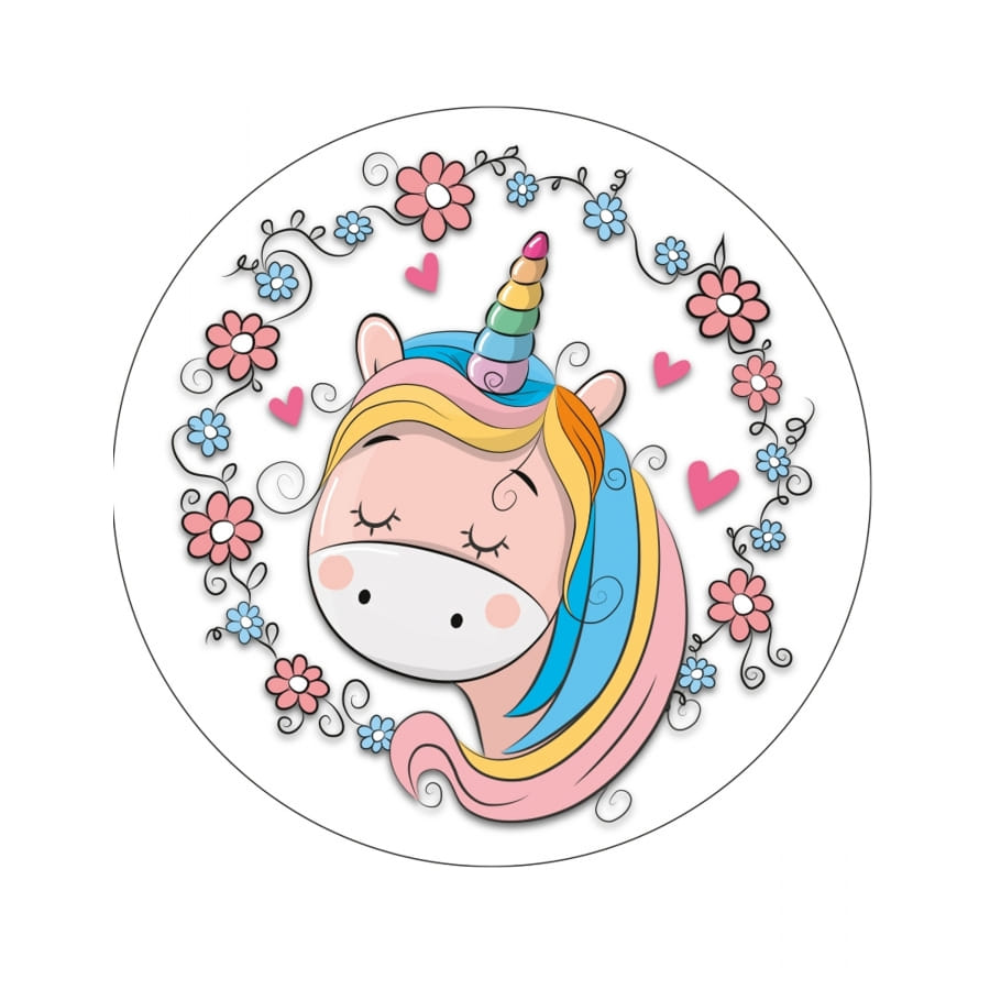 Ce disque de 21 cm de diamètre en sucre présente l'effigie d'une magnifique licorne à la crinière et la corne décorées aux couleurs de l'arc-en-ciel.