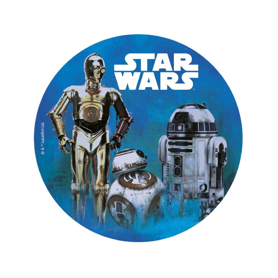 Sur ce disque comestible, vous découvrirez sur un fond coloris bleu les droïdes C-3PO, R2-D2 et BB-8 ainsi que les mots « Star Wars » en lettre de couleur blanche.