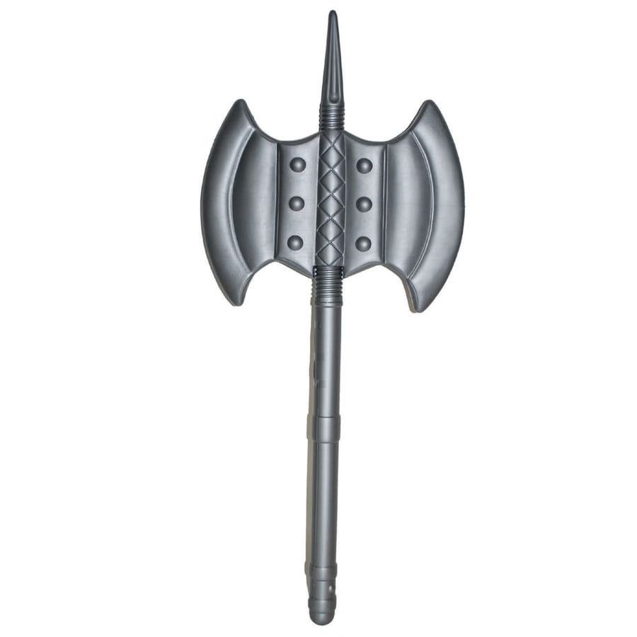 C'est une hache à double lame, faite en plastique de couleur gris argent.