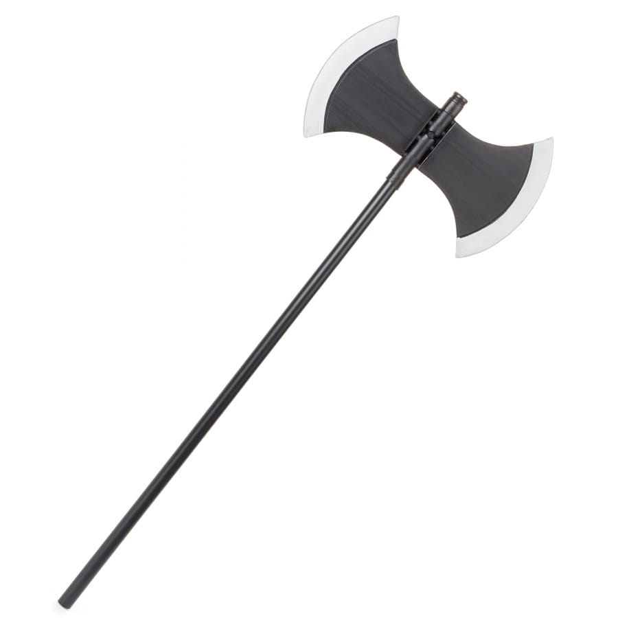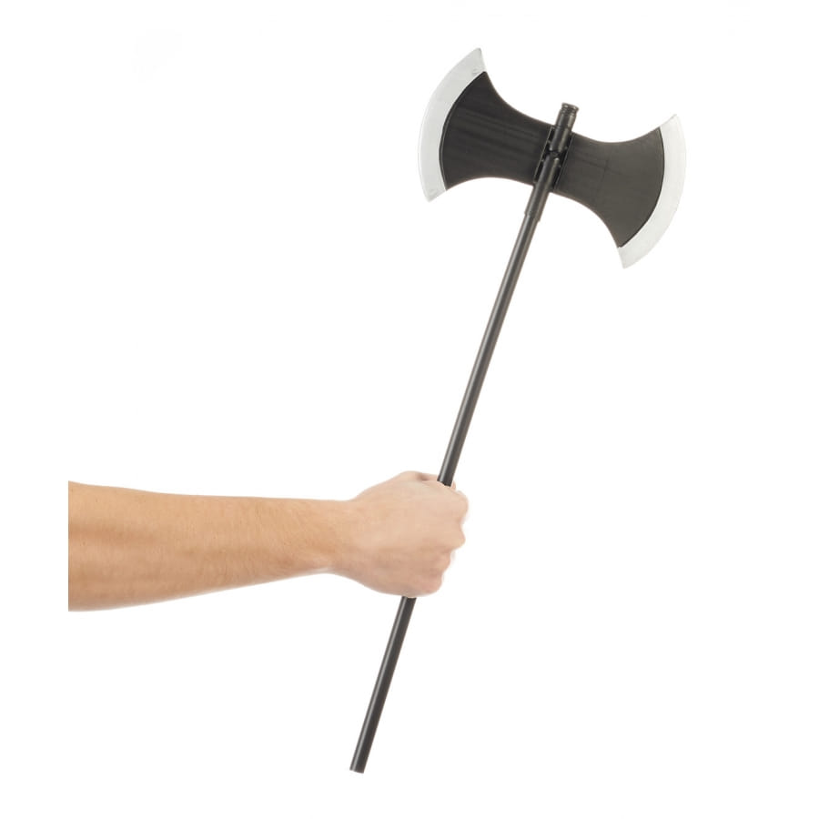 Cette double hache noire en plastique, 60cm, est dotée d'un manche et de deux fausses lames en plastique démontables. Sa longueur et sa couleur la rendent telle une vraie hache, alors que sa matière plastique la rend légère. Elle sera parfaite pour un déguisement médiéval pour la fête des morts, comme un déguisement de chevalier. Les parties lames sont de couleur grise, tandis que les autres parties sont noires. Cet accessoire pourra terroriser les invités qui ont peur de se faire trancher la tête.