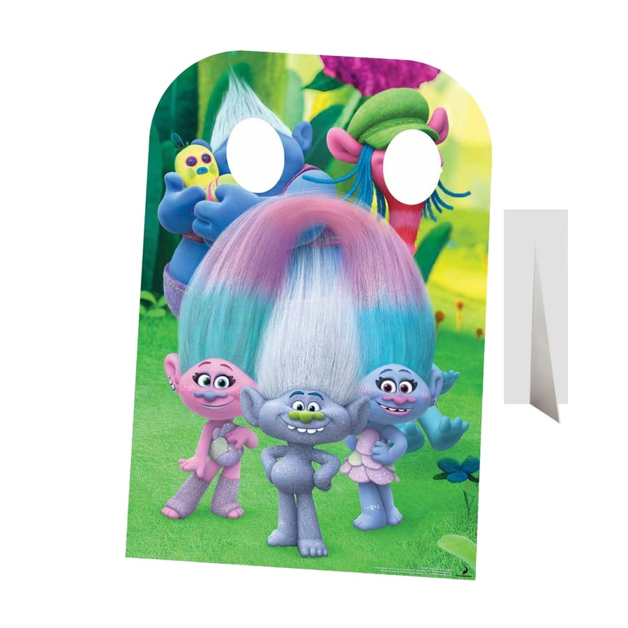 Pour amuser les petits, servez-vous de ce double passe tête de trolls pour enfant. Il est fait en carton et mesure 94 x 136 cm, en format géant. Sur le devant figurent trois trolls avec les cheveux en épi, et en arrière-plan, deux trolls avec les trous pour passer la tête, le tout sur fond de jardin fleuri.