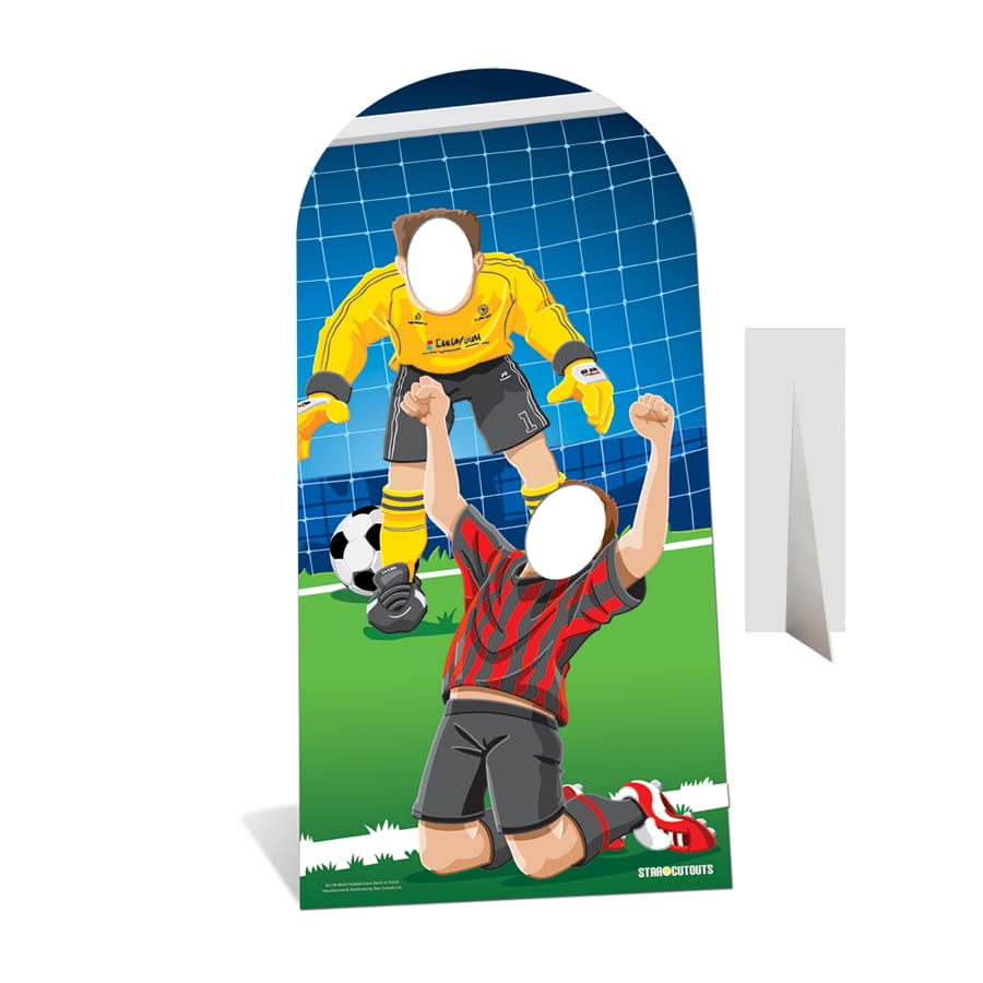 Votre enfant adore le football ? Pour sa fête d'anniversaire, offrez-lui un cadeau exceptionnel (attention, taille adulte/ado). Ce Double passe tête gardien et attaquant peut faire l'objet d'un divertissement pour les adultes et les enfants invités à la fête qui pourront y passer leurs têtes pour prendre des photos. Cette figurine multicolore en carton a une dimension de 192 x 94 cm.