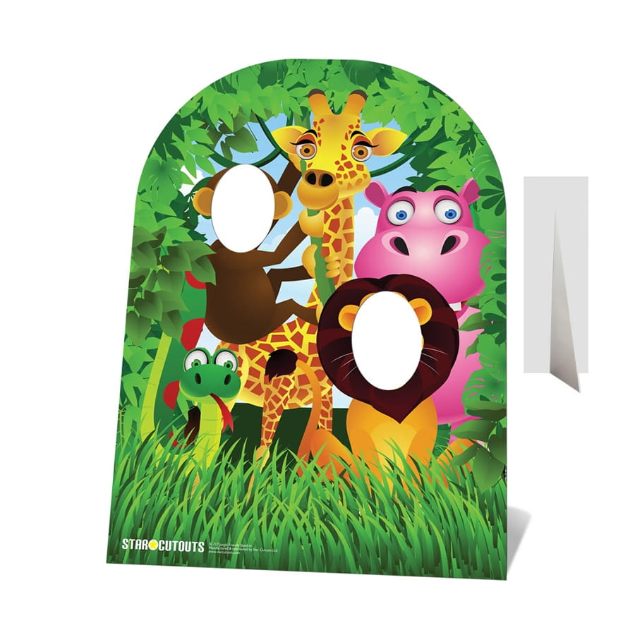 Ce décor double passe-têtes animaux de la jungle rigolos mesure 120 x 103 cm (taille enfant), et il est fait en carton. Il comporte deux trous au niveau de la tête du lion et de celle du singe, afin que les enfants puissent y passer leur tête et prendre des photos. Cet ornement est parfait pour une fête sur le thème de la jungle, des animaux ou encore de l'humour.