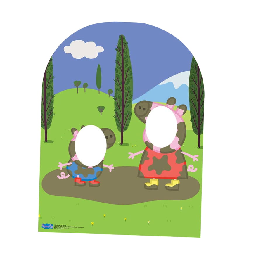 Proposez à vos enfants de prendre les places des têtes de Peppa et Georges dans ce double passe-têtes Peppa Pig pour enfant, nous parions qu'ils en seront ravis ! Sur fond de jardin, avec les deux petits cochons dans un bain de boue, cette figurine fait 123 x 94 cm. Du fou rire en perspective !