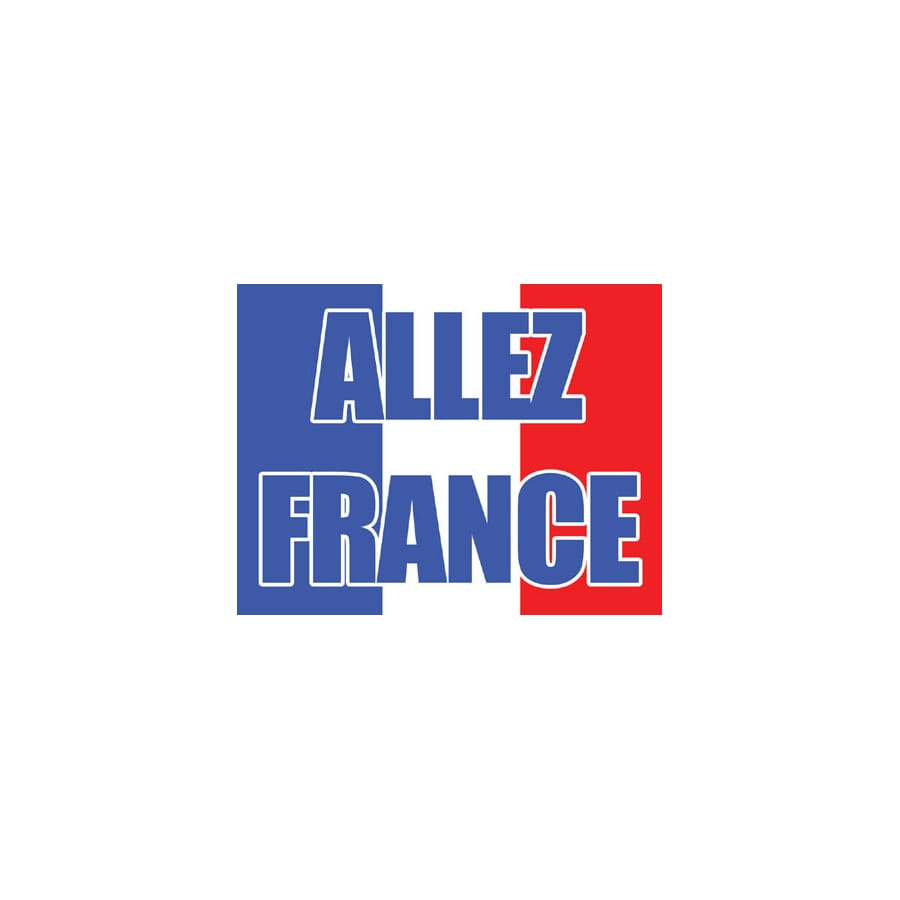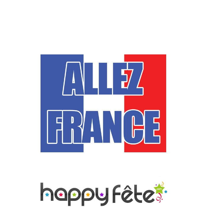 Il affiche toujours les fameuses bandes verticales de couleur bleue, blanche et rouge, mais il comporte aussi l'inscription "Allez France" imprimée en lettres majuscules.