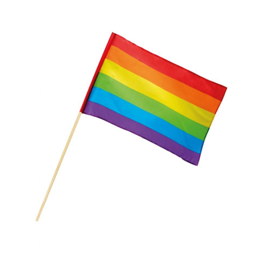 Le drapeau arc-en-ciel monté sur tige en bois longue de 77 cm.