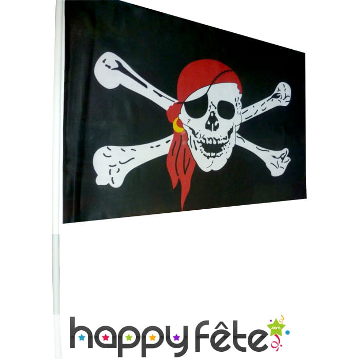 Pour l'anniversaire de votre enfant ce drapeau de pirate éblouira vos petits invités. Vous pouvez aussi l'utiliser à plusieurs reprises comme une fête ayant pour thème piraterie. Ce drapeau noir avec une tête de mort de couleur blanc qui a un bandeau sur la tête. Ce drapeau de pirate avec hampe fait 48cm de large sur une hauteur de 31cm.