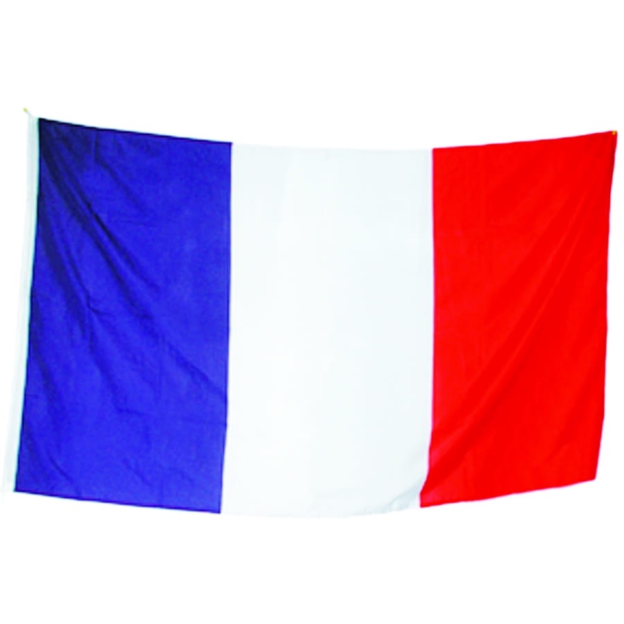 Drapeau français en polyester non gainé avec anneaux. Ce magnifique drapeau de France mesure 90 centimètres de hauteur sur 150 centimètres de largeur. Sortez-le pour une fête nationale ou pour supporter votre équipe!