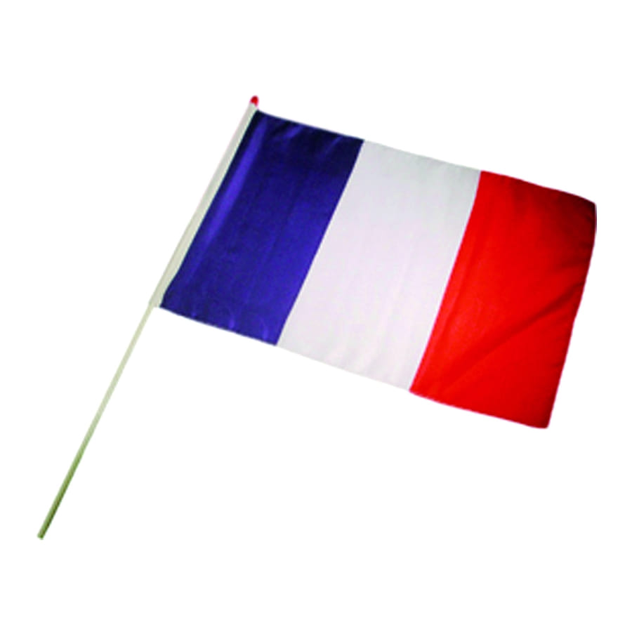 Drapeau de la France en polyester monté sur une hampe en bois. Cet accessoire mesure 30 centimètres de hauteur sur 45 centimètres de largeur. Emportez avec vous ce drapeau bleu, blanc et rouge pour encourager votre équipe.