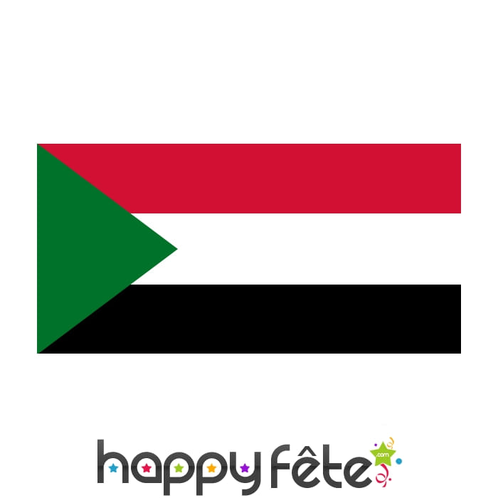 Le pavillon du Soudan est composé d'un triangle vert à la hampe et de trois bandes horizontales de couleur rouge, blanche et noire. Celui qui vous est proposé mesure 50 cm de long sur 40 cm de large, avec un ourlet sur 3 côtés, fabriqué en maille polyester très résistant et perméable, et traité à l'anti-UV. Son montage de sangle et d'anneau permet de le hisser facilement sur un mât.