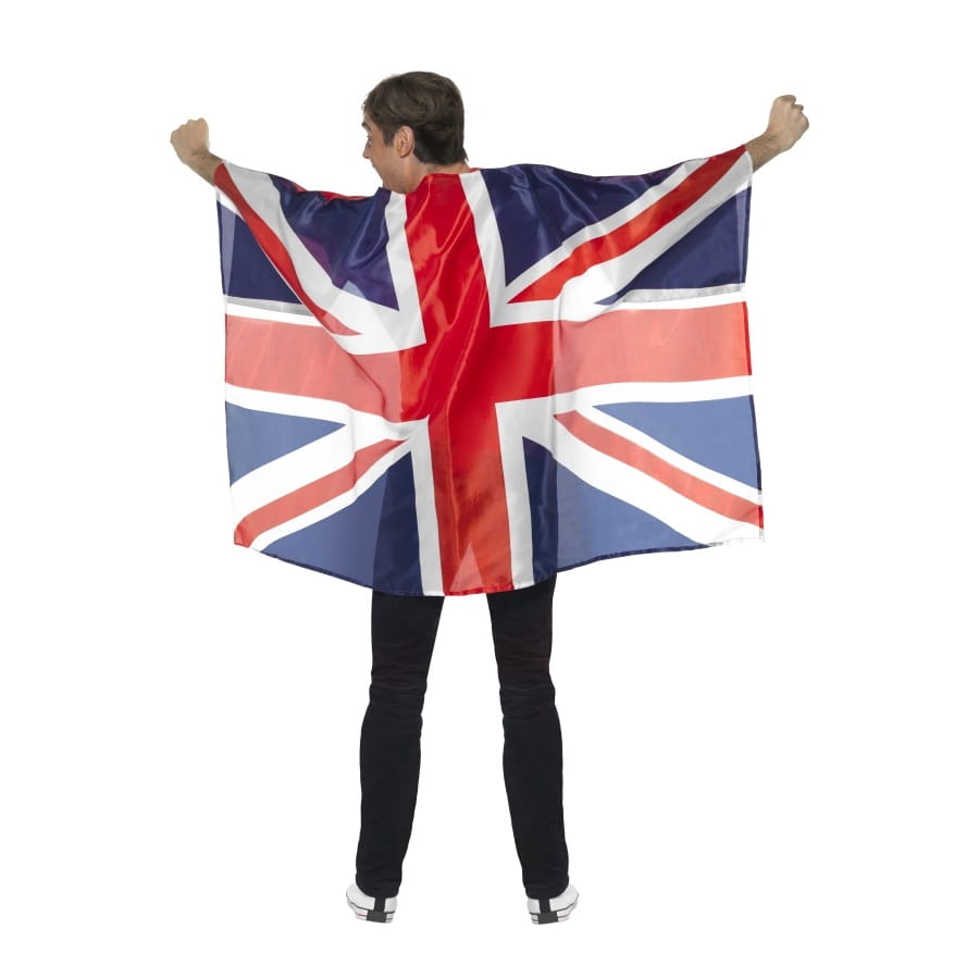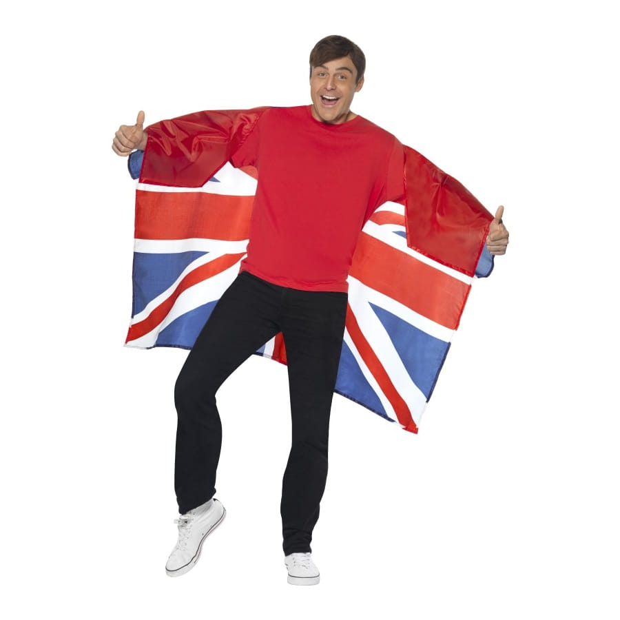 Drapeau britannique mettable de couleur bleue, blanche et rouge, pour homme. Il mesure 90 centimètres de long et 150 centimètres de large. Enfilez-le pour un carnaval ou un évènement sportif.