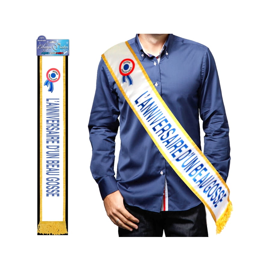 Le jour J est pour bientôt ? Fêtez comme il se doit l'anniversaire de votre meilleur ami en lui offrant cette belle écharpe l'anniversaire d'un beau gosse. Il la portera fièrement pendant sa surprise party et deviendra bien évidemment le centre d'attention. L'écharpe fait une longueur de 184 cm. Elle est formée par un tissu blanc aux liserés dorés. L'inscription "l'anniversaire d'un beau gosse" y a été imprimé en gros caractères dans la couleur bleu pailleté.