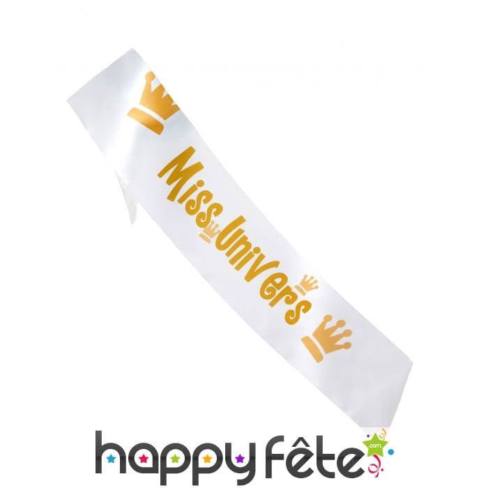 Elle présente, en lettres dorées, l'expression "Miss Univers" accompagnée de plusieurs couronnes.