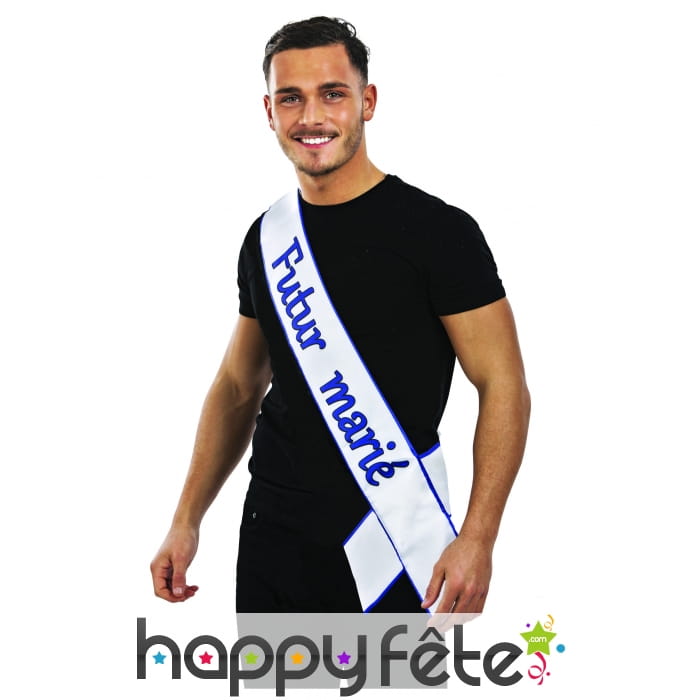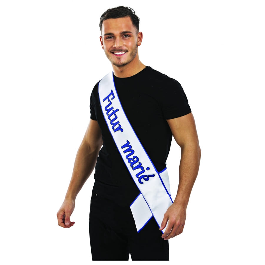 Devenez la star de votre enterrement de vie de garçon, grâce à l'écharpe pour futur marié blanche et bleue.