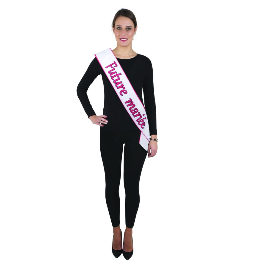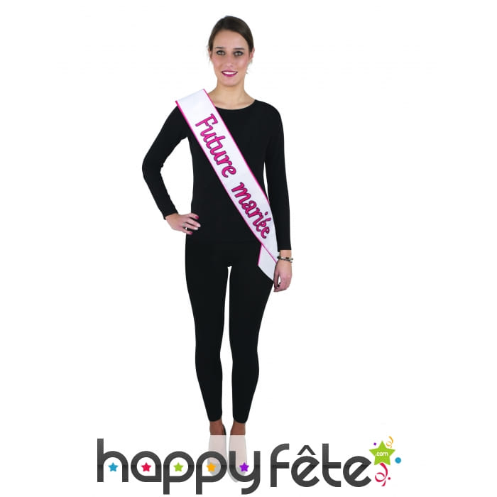 Cette écharpe est imprimée de l'inscription "Future mariée" écrite en rose.