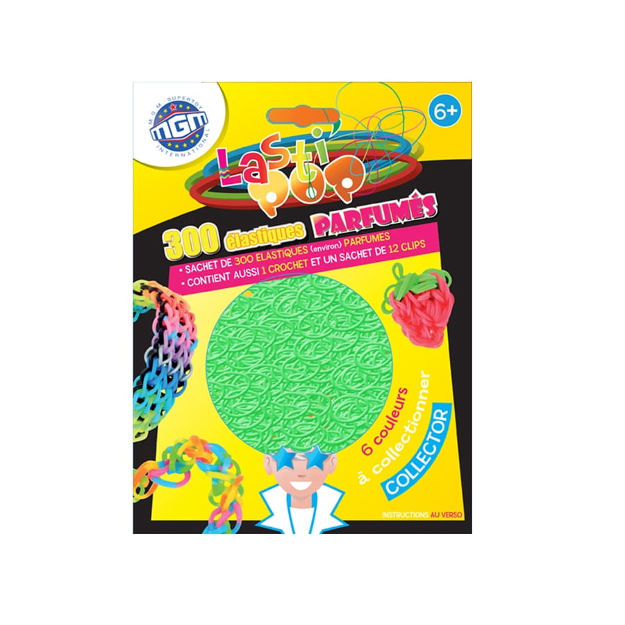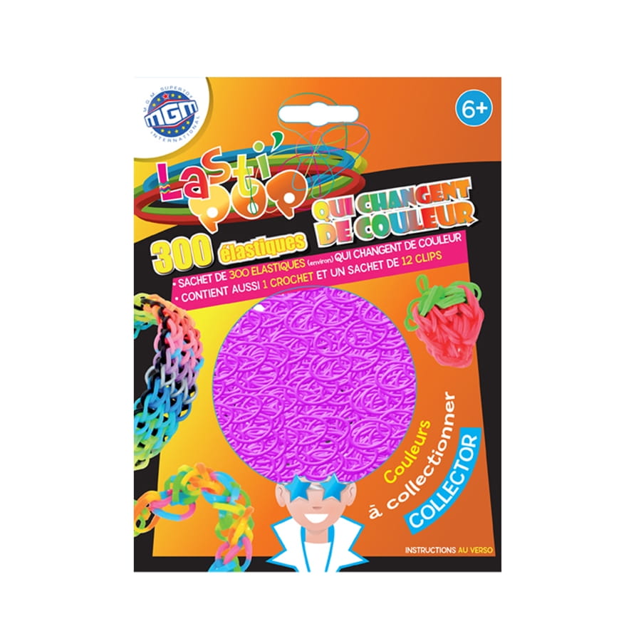 Ce beau sachet que vous voyez là contient 300 élastiques LASTIPOP, de couleur verte, blanche ou violette, au choix. Mais ce n'est pas tout, ces élastiques magiques réagissent aux UV, c'est à dire qu'ils changent de couleur sous leur effet : le vert devient violet, le blanc devient bleu et le violet devient rouge. Vous pourrez réaliser un tas de choses avec cet article, juste en utilisant vos doigts, comme des bracelets, des coeurs, des animaux, etc...