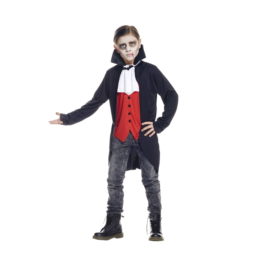 Dracula et compagnie vont sortir pour fêter Halloween cette année. Intégrez leur bande avec cet élégant costume de vampire pour enfant garçon. En choisissant ce déguisement, vous aurez affaire à un manteau noir très chic qui descend jusqu'à mi-cuisses. Il est muni d'un col façon vampire, relevé à l'arrière. Vous disposerez également d'un beau gilet de couleur rouge, ainsi que d'un jabot pour marquer l'élégance de la tenue. Notez que le jabot est décoré d'une petite chauve-souris noire. Pour une allure encore plus stylée, optez pour un pantalon jean pour accompagner l'ensemble, et n'hésitez pas à miser sur un peu de maquillage pour ternir le teint.