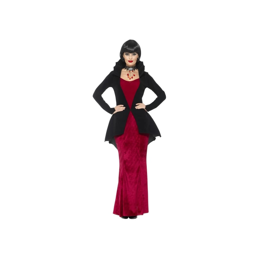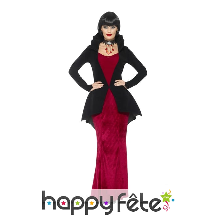 Mesdames, jouez savamment avec votre capacité de séduction durant halloween en revêtant l'elegant costume de vampiresse rouge et noir luxe. En effet, voilà un costume qui mettra en avant votre charme avec sa robe rouge symbole de l'amour, mais aussi couleur du sang. Cette longue robe est assez près du corps jusqu'aux genoux, mais elle s'évase vers le bas. Une veste assez longue évasée noire est rattachée à la robe. Elle possède un col montant renforçant ainsi le côté vampire et par la même occasion l'élégance du déguisement. Cet élégant costume de vampiresse rouge et noir luxe peut être complété par une perruque telle que la perruque carrée noire frange en pointe disponible sur happyfete.