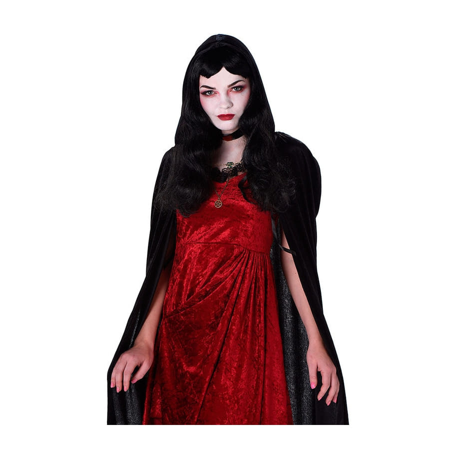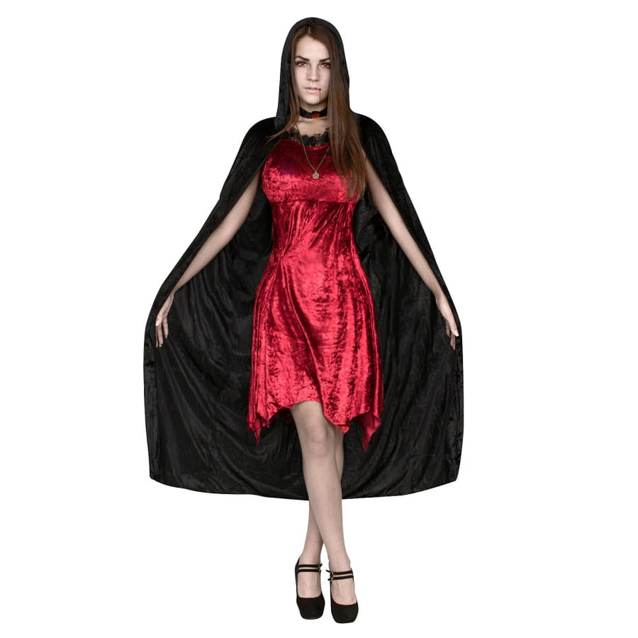 Nous vous présentons cette élégante tenue de vampire rouge avec cape noire.
