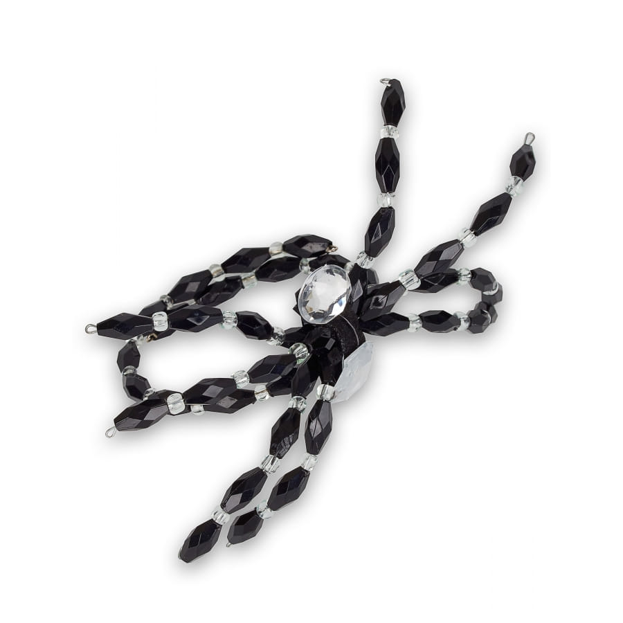 La broche araignée est dotée d'un corps en grosses perles argentées et de pattes à petites perles noires et argentées.