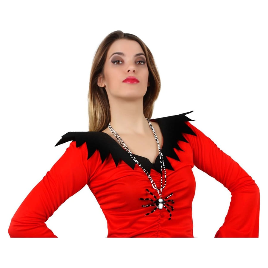 Le collier est formé par des petites perles noires et blanches accompagnées d'un pendentif araignée dont le corps comporte 2 grosses perles argentées et les pattes en fil de fer sont agrémentées de perles noires et argentées.