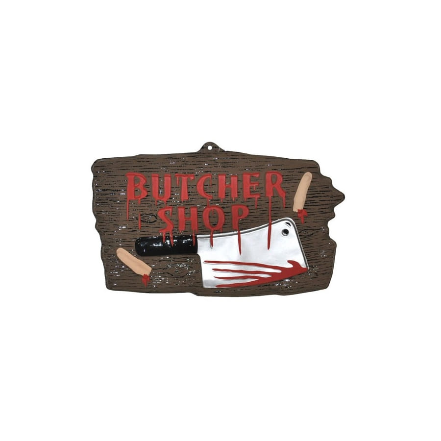 L'enseigne Butcher shop de 47 x 27 cm est en plastique fin.