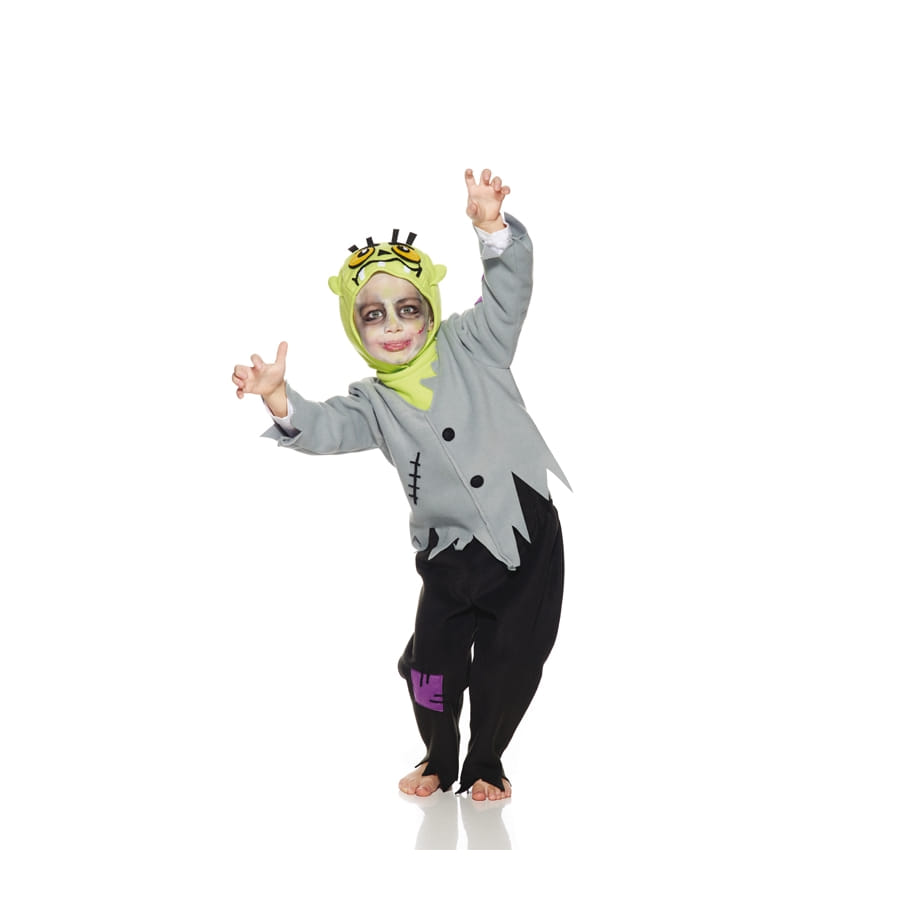 La fête des morts réveille toutes les créatures des ténèbres dont les zombies. Ces derniers seront de la partie sous différents aspects grands ou petits. En effet, les morts vivants ne sont pas tous des adultes. Happyfête donne l'occasion aux plus jeunes de vivre cette expérience grâce à ce déguisement de zombie en miniature. Décliné sous forme d'une tunique gris et d'un pantalon noir, la découpe laisse apparaître l'esprit d'Halloween. Une cagoule vert fluo ornée de deux petites oreilles d'ogre vient compléter le tout. Dans cette tenue, votre bout de chou va semer la panique sur son passage.