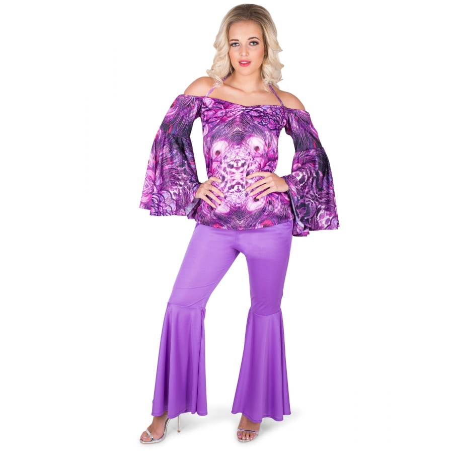 Nous parlons ici de notre ensemble disco violet avec motifs, épaules nues.