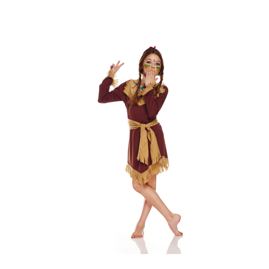 Une tradition, une culture, un mode de vie, tout cela à faire découvrir à votre petite fille tout en s'amusant ! Elle deviendra la nouvelle princesse d'une tribu indienne grâce à cet ensemble marron de petite indienne. Le costume présente une magnifique robe marron agrémentée de franges beiges. La robe est à manches longues et quelques motifs indiens ont été imprimés sur le devant. Très classique mais originale, la ceinture beige à franges est à attacher autour de la taille. La coiffure sera accessoirisée par un superbe bandeau indien orné d'une plume. Vous pouvez vous procurer cet article dans différentes tailles, appropriées aux petites filles de 5 à 11 ans.