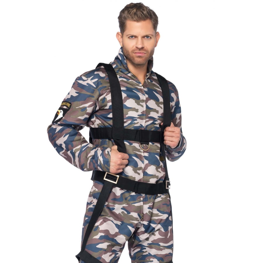 La combinaison est imprimée de tons verts qui évoquent à la perfection les tenues camouflages militaires.
