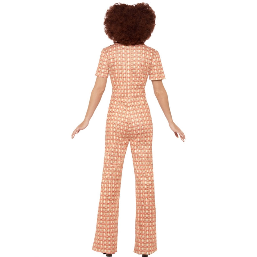 Vous vous souvenez sûrement de ces combinaisons tube ou patte d'éléphant, très en vogue dans les années 70, et qui aujourd'hui rappellent immédiatement cette époque. Et bien, nous l'avons dégotée pour vous, Mesdames, et nous vous proposons cet ensemble à motif des années 70 pour femme. Cet ensemble est représenté par la fameuse combinaison à pantalon, possédant une grande encolure pointue et des manches courtes. Cintrée pour bien vous mettre en valeur, cette combinaison est à pattes d'éléphant vers le bas. Elle est ornée de motifs de couleur orange et s'ouvre avec une fermeture sur le devant. Les tailles dont nous disposons pour ce déguisement sont : L, M, S et XL.