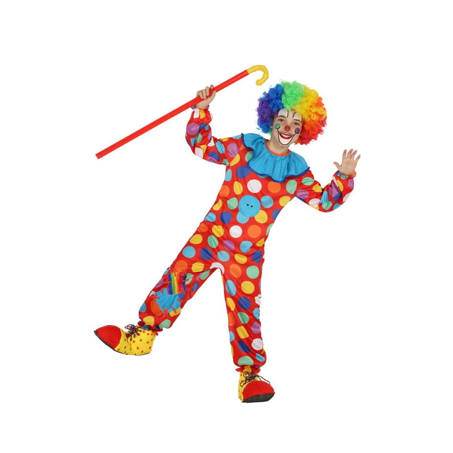 Ce déguisement comporte une combinaison rouge à pois multicolores et un col.