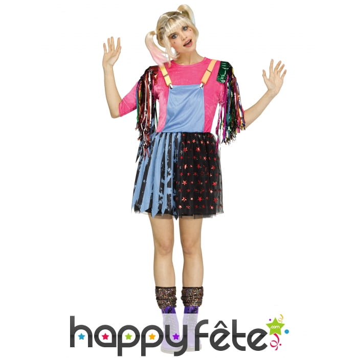 La jupe est un tutu bleu et découpé en pointe d'un côté, et avec étoiles rouges sur fond noir de l'autre.