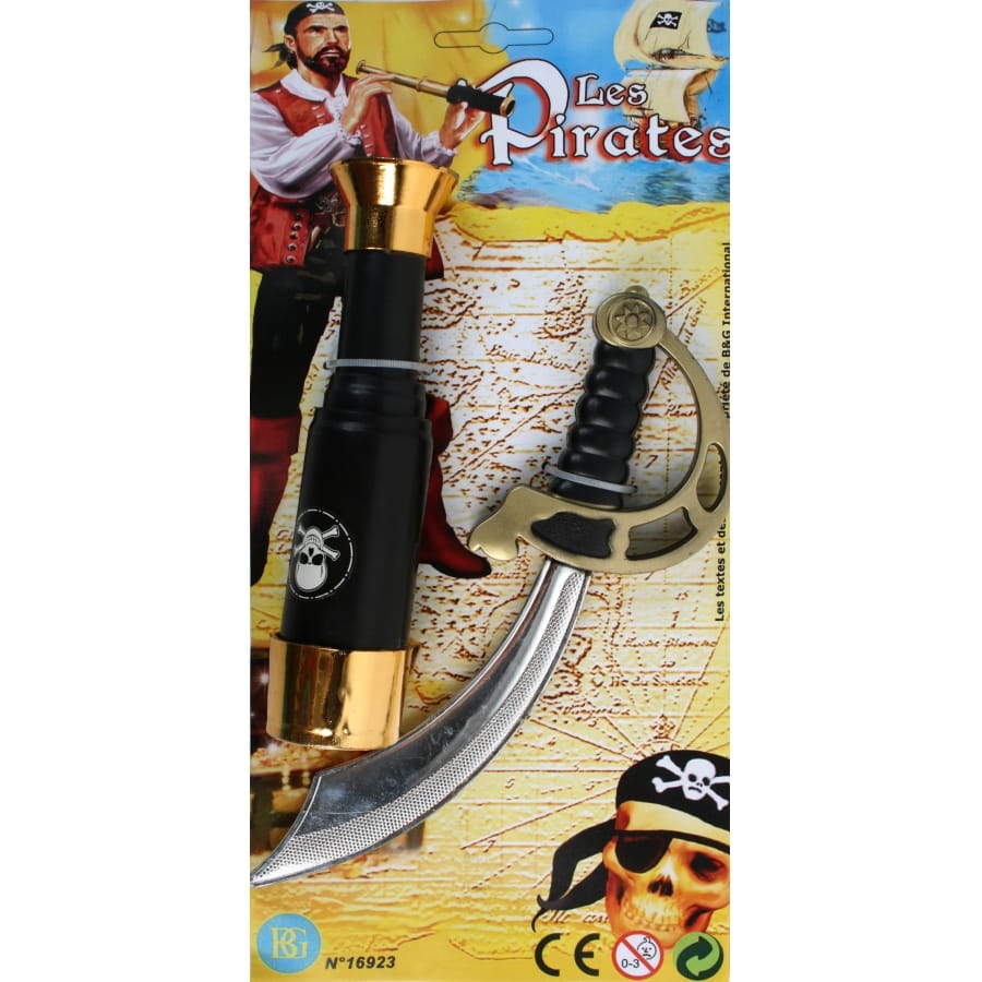 Set de pirate composée d'une épée et d'une longue-vue. L'épée est de couleur noire et grise et mesure 21.6 centimètres tandis que la longue-vue est de couleur noire et dorée et mesure 26 centimètres. Au moment de passer la commande, vous ne pourrez choisir ni le modèle ni la couleur des accessoires. Vous les recevrez comme présentés. Ce set est idéal pour un déguisement ou en tant que cadeau simple.