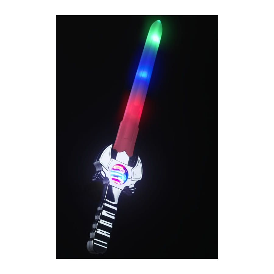 Votre enfant sera ravis de jouer avec cette épée futuriste. Vous pouvez aussi vous en servir comme accessoire pour compléter un déguisement sur le thème science fiction. La manche de cette épée futuriste est argenté et la lame est lumineuse de couleur bleu, vert et rouge.