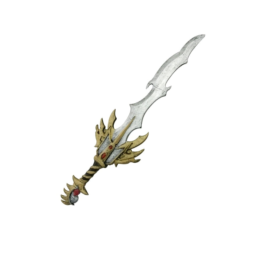 Nous vous proposons ici une belle épée médiévale en latex, qui a une forme très particulière, mesurant 54 cm. La poignée est dorée et la lame est argentée, ce qui donnera un effet d'acier. Vos amis seront impressionnés et joueront le jeu avec plaisir, grâce à cette somptueuse épée. Complétez votre déguisement de chevalier, de guerrier ou de viking par ce sabre lors de vos soirées à thème.