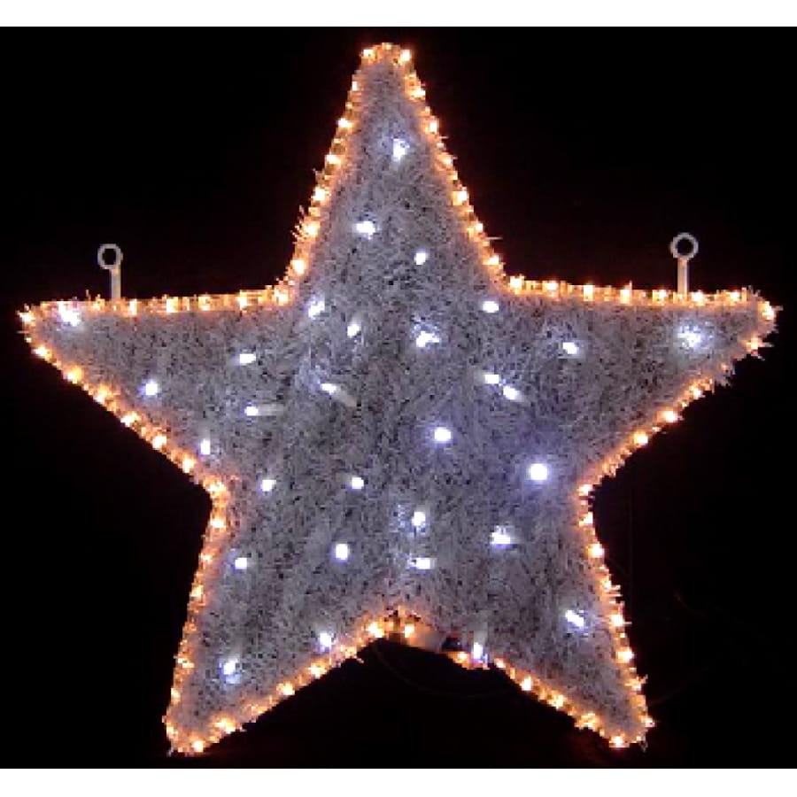Grande étoile clignotante blanche formée d'un tube Led mesurant 2 mètres. L'étoile contient également 72 ampoules et 24 Leds. Elle mesure 56 sur 56 centimètres et est spécialement conçue pour une décoration intérieure. Elle sera parfaite pour la Noël.
