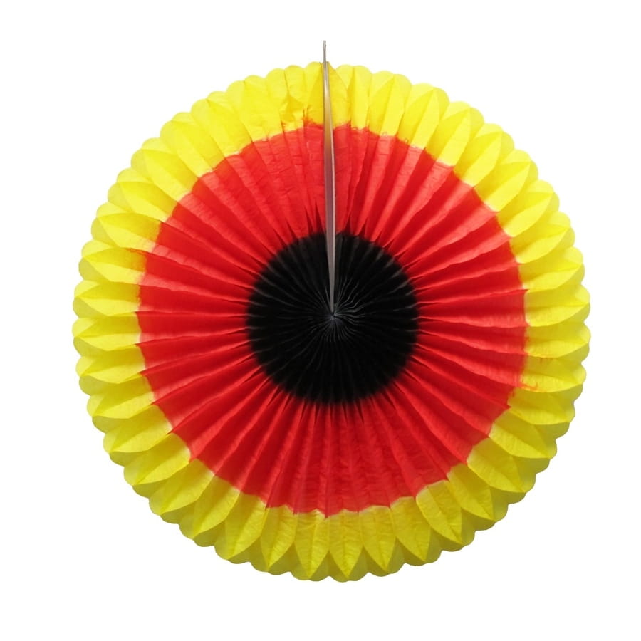 Les drapeaux nationaux allemand et belge sont quasi-identiques en termes de couleurs, la seule différence étant que l'un a des bandes horizontales et l'autre verticales. Que ce soit donc pour fêter la fête nationale allemande ou belge, une victoire des Allemands ou des Belges, cet éventail vous sera fort utile. Il est en rouge, jaune et noir, les couleurs de ces 2 pays, arrondi avec un diamètre de 36 cm, fabriqué en papier. Et n'hésitez pas à voir sur notre site des éventails d'autres pays !