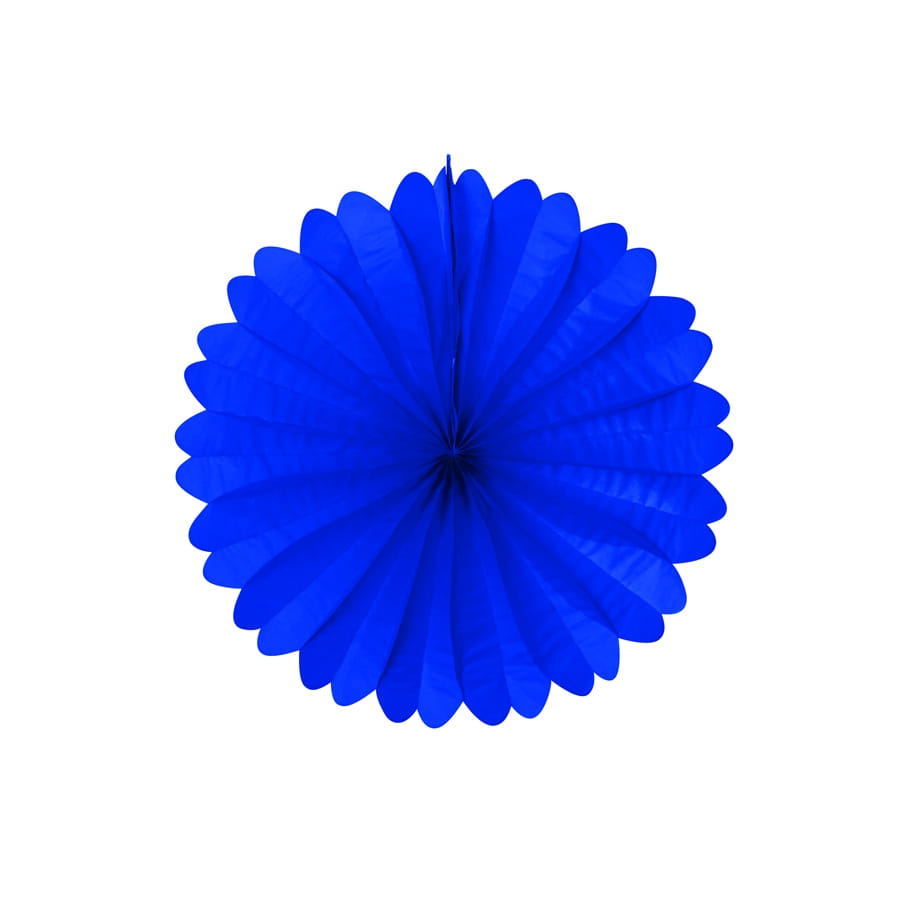 Eventail en papier de couleur bleu foncé. Cet accessoire de décoration mesure 50 centimètres. Il est parfait pour décorer une salle de fête à l'occasion de la Noël, d'un mariage, d'un carnaval ou d'un anniversaire.