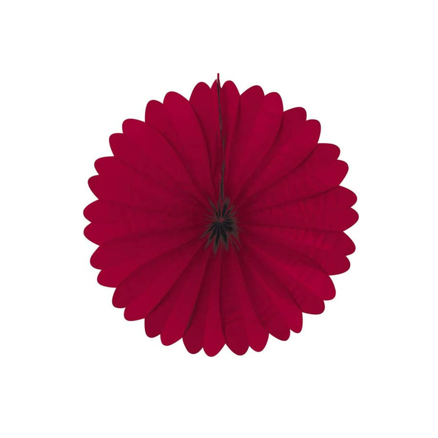 Eventail de décoration entièrement en papier. Cet accessoire de couleur bordeaux mesure 50 centimètres. Vous pourrez l'utiliser pour la Pâques, un anniversaire, un mariage, la Saint Valentin, la Noël, le Nouvel An, un carnaval ou une naissance.